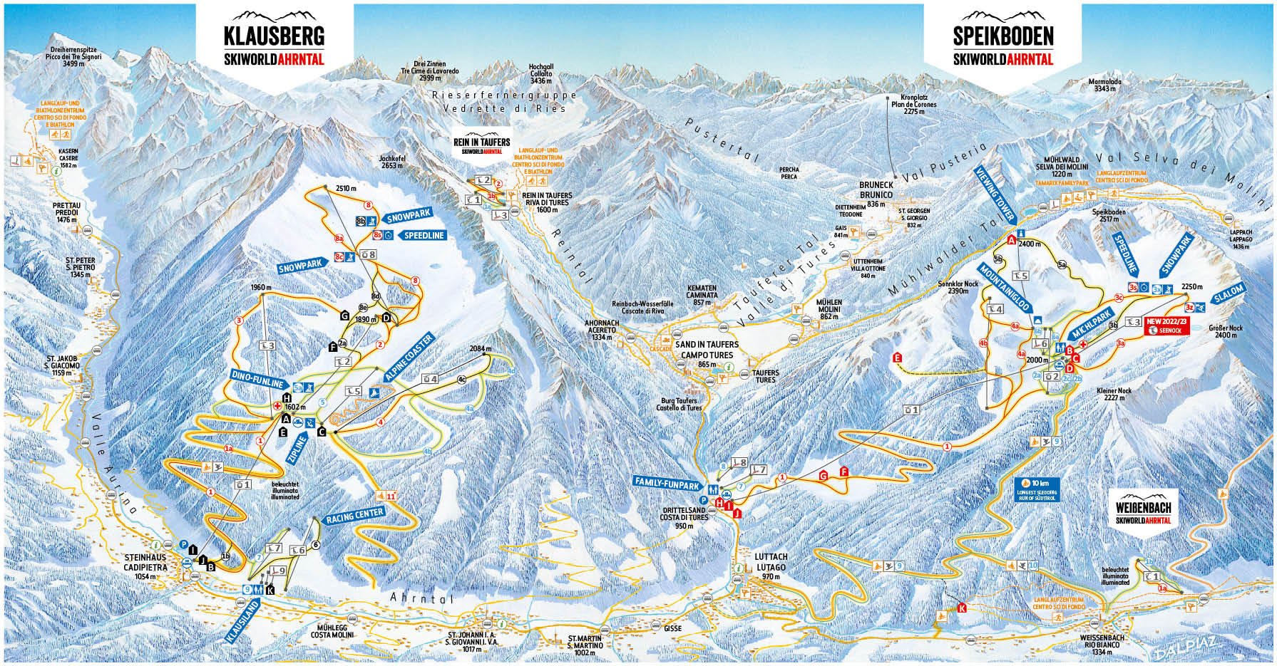 Der Skiort Ahrntal (italienisch Valle Aurina) ist direkt an den Klausberg angebunden, welcher als Teil der Skiworld Ahrntal über einen Zugang zu 85,4 Pistenkilometern verfügt. Auf einer Höhe von 1.050 bis 2.510 Metern stehen dir auf dem Klausberg selbst rund 33 Pistenkilometer und 11 Skilifte zur Verfügung.