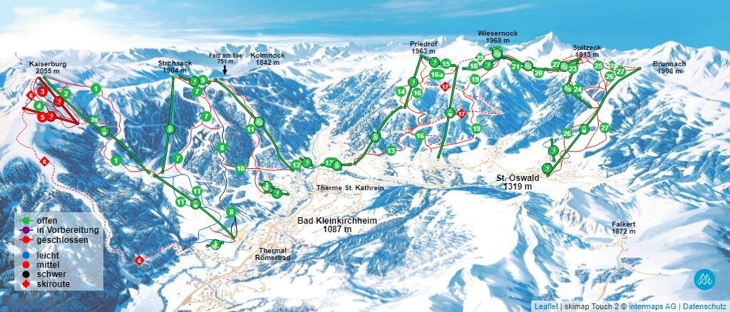 Der sonnige Skiort Bad Kleinkirchheim liegt in Kärnten im gleichnamigen Skigebiet. Rund um die Hausberge Kaiserburg (2.056 Meter) und Strohsack (1.904 Meter) stehen dir 103 bestens präparierte Pistenkilometer sowie 24 Bahnen und Lifte zur Verfügung. In dem Weltcuport steht aber nicht nur das Skifahren im Mittelpunkt. Auch das Wellness-Angebot kann sich mit gleich zwei Thermen sehen lassen.
