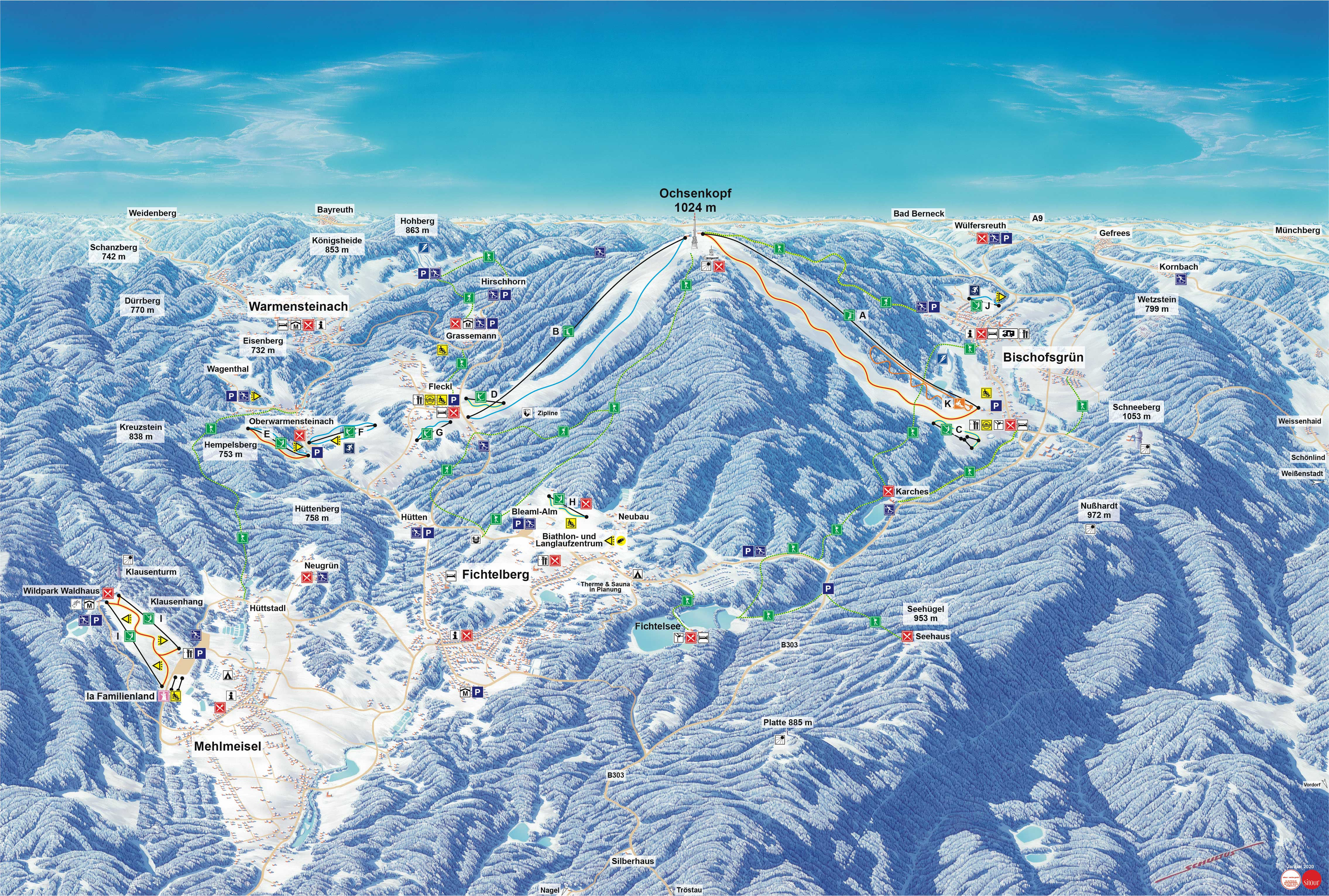 Im Skigebiet selbst erwarten dich 4,7 Kilometer bestens präparierte Pisten. Primär verteilen sich diese Pistenkilometer auf die 1,9 Kilometer lange Abfahrt Süd und die 2,3 Kilometer lange Abfahrt Nord, die nach Bischofsgrün führt. Bei dieser Piste handelt es sich um eine rote Piste mit mittlerem Schwierigkeitsgrad, bei der du einen Höhenunterschied von 350 Metern zurücklegst.