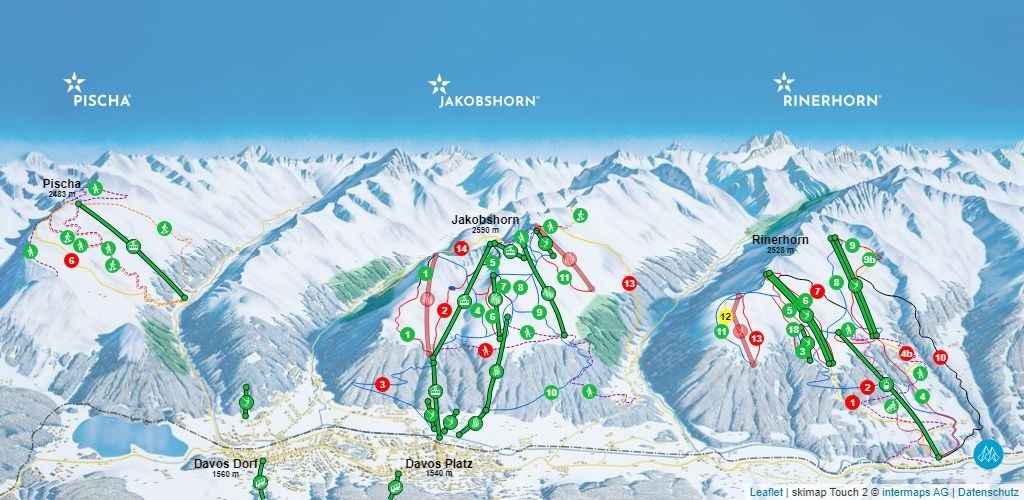 Das Jakobshorn ist aber auch für Anfänger und Familien interessant. Für die gibt es im unteren Bereich des Gebiets eine leichte Piste, die mit der 2er-Sesselbahn Carjöl erreichbar ist. Aber auch am Berg selbst gibt es noch einige weitere blaue Pisten. Für die kleinen ist außerdem viel Spaß im Disney-Parkour der Kinderskischule garantiert.