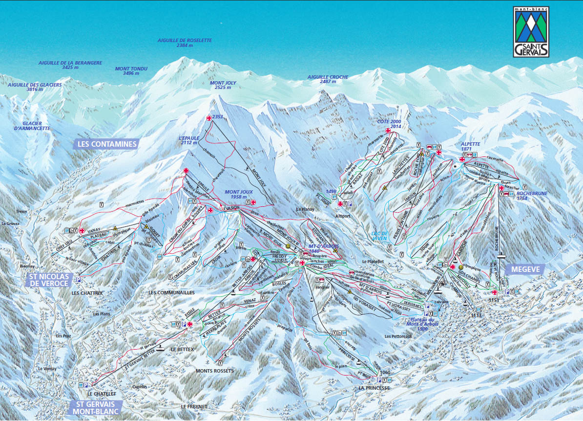 Das gesamte Skigebiet Saint Gervais Mont-Blanc erstreckt sich über fantastische 449,45 Pistenkilometer. Diese setzen sich zusammen aus 93,45 grünen, 133,5 blauen, 160,2 roten und 62,3 schwarzen Pistenkilometern. Das Skigebiet erstreckt sich auf einer Höhe von 850 bis 2.353 Metern und liegt so recht hoch. Aufgrund der Höhenlage ist die Schneesicherheit hier gut. Außerdem sorgen mehrere hundert Schneekanonen für eine zusätzliche Beschneiung auf circa 20 % der Pisten.