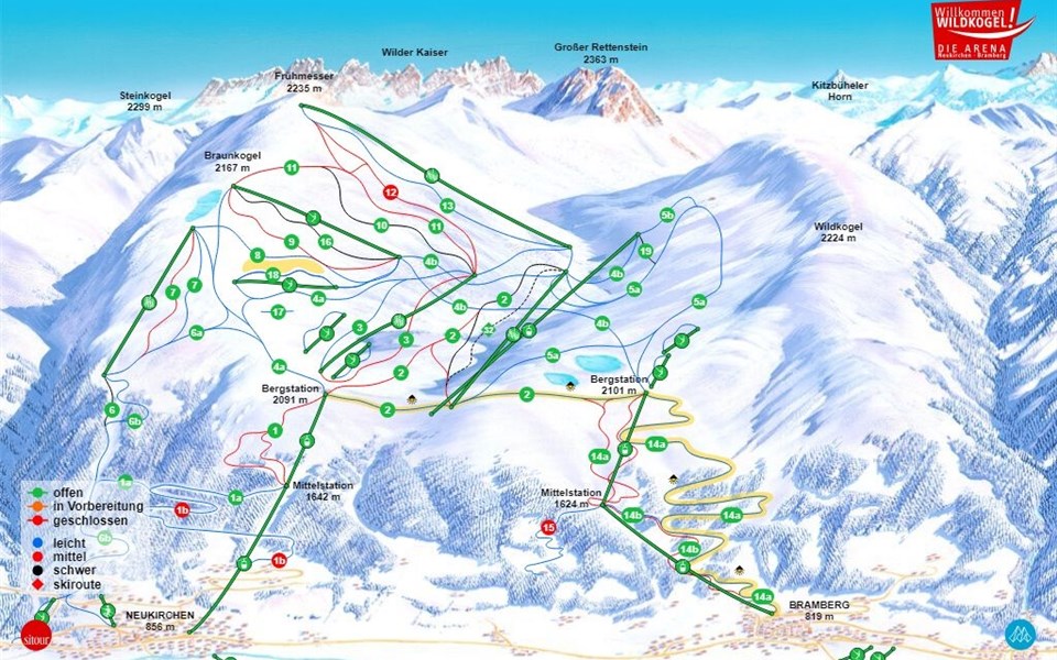 Bei den 75 Pistenkilometern handelt es sich überwiegend um leichte bis mittelschwere Pisten – perfekt also für Familien, Anfänger und Wiedereinsteiger. Es gibt zwei Talabfahrten. Die Talabfahrt nach Neukirchen endet am Ortsrand von Neukirchen. Von hier kannst du den Skibus zurück zur Wildkogelbahn nehmen. Neben der Wildkogelbahn findest du im Tal auch einen Schlepplift und einen Anfängerlift.