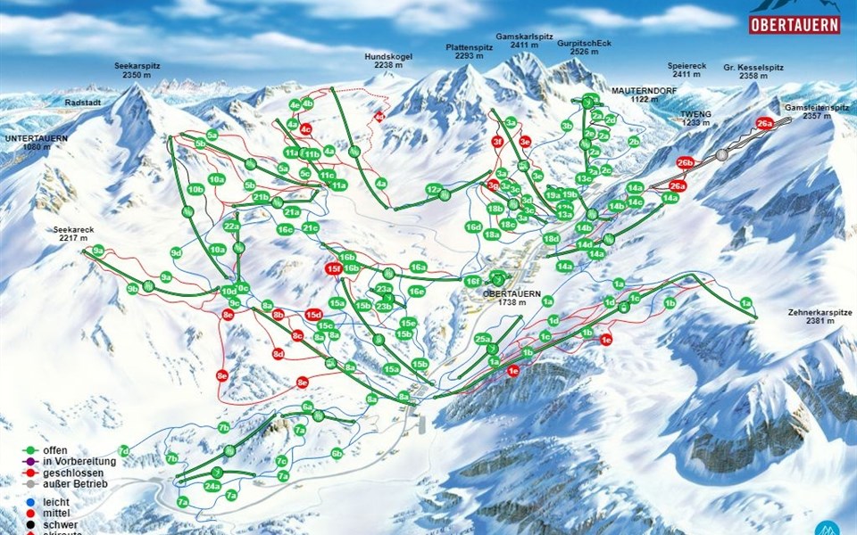 Obertauern, der höchstgelegene Wintersportort im Salzburger Land und der schneereichste Wintersportort Österreichs, liegt inmitten des gleichnamigen Skigebiets Obertauern. Wenn du eine Unterkunft in dem kleinen Skiort hast, hast du direkten Zugang zu 100 Pistenkilometern sowie 26 Seilbahn- und Liftanlagen.