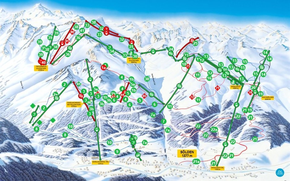 Der Skiort liegt in einer Höhe von 1.368 Metern vergleichsweise sehr hoch. An Unterkünften hast du hier eine große Auswahl. Du kannst zwischen einfachen oder luxuriösen Hotels wählen. Außerdem gibt es verschiedene Pensionen, Apartments oder Ferienhäuser und Chalets. In Sölden gibt es 2 Talstationen, die dich auf die Berge bringen. Die Gaislachkogel-Bahn und die Giggijoch-Bahn. Insgesamt befinden sich im ganzen Gebiet 31 Liftanlagen, 144 präparierte Pistenkilometer und 2 Kilometer Skirouten.