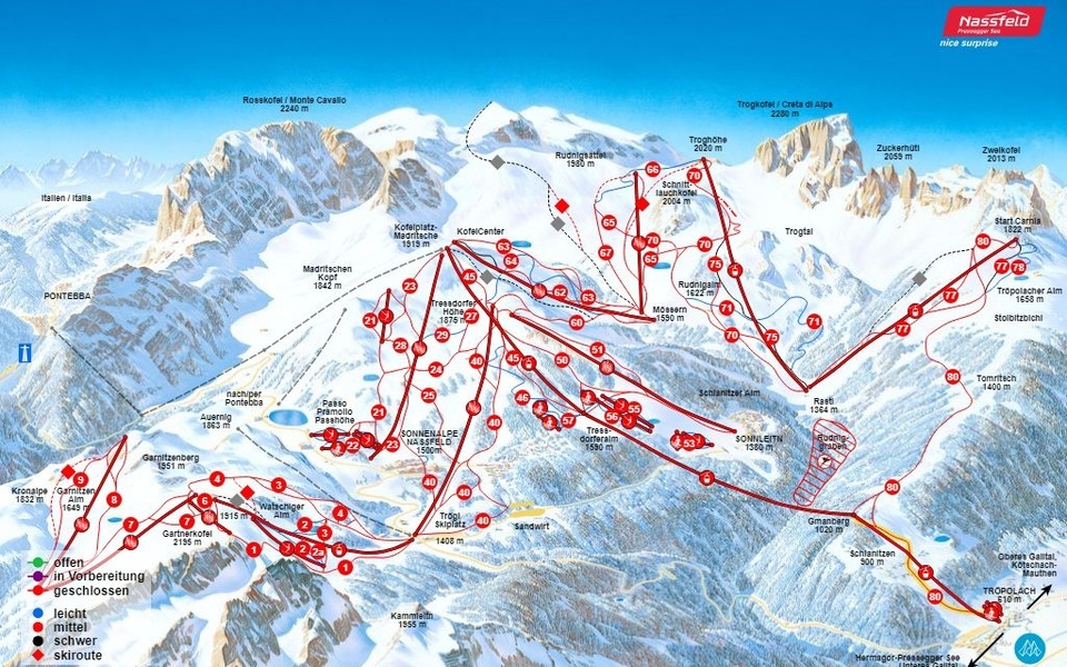 Der Skiort Sonnenalpe Nassfeld ist an das Skigebiet Nassfeld in Österreich, einem der größten und bekanntesten Skigebiete in Kärnten, angebunden. Mit einer beeindruckenden Gesamtpistenlänge von 110 Kilometern bietet das Skigebiet eine Vielzahl von Abfahrten für Skifahrer aller Könnensstufen. Die Pisten sind in 30 Kilometer leichte, 69 Kilometer mittlere und 11 Kilometer schwere Abfahrten unterteilt. Im Ort gibt es eine Talstation, die den Zugang zu den Pisten erleichtert. Die Talabfahrten bieten eine direkte Verbindung vom höchsten Punkt des Skigebiets auf 2.020 Meter Höhe bis hinunter zur Talstation.
