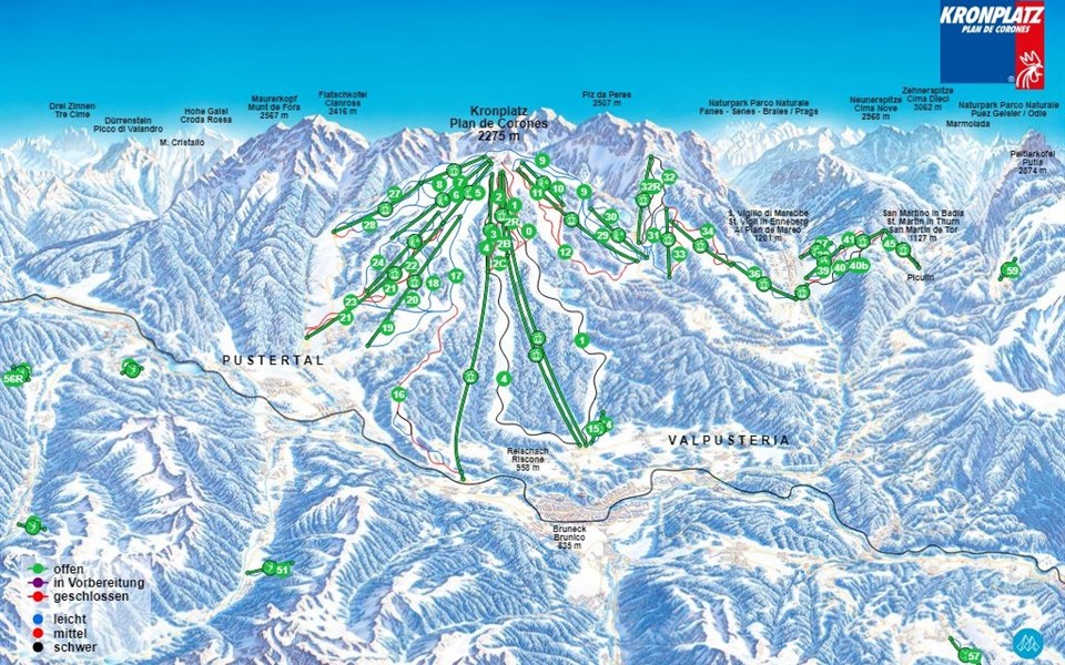St. Vigil – oder auch San Vigilio genannt – ist eine kleine Gemeinde im Enneberger Tal in Südtirol. Sie liegt am Fuße des Kronplatzes, wo du eine gute Auswahl an blauen Pisten hast. Du kannst von hier aus aber auch mit der Gondelbahn auf den Berggipfel des Kronplatzes hinauffahren, wo dich insgesamt 121 Pistenkilometer erwarten.