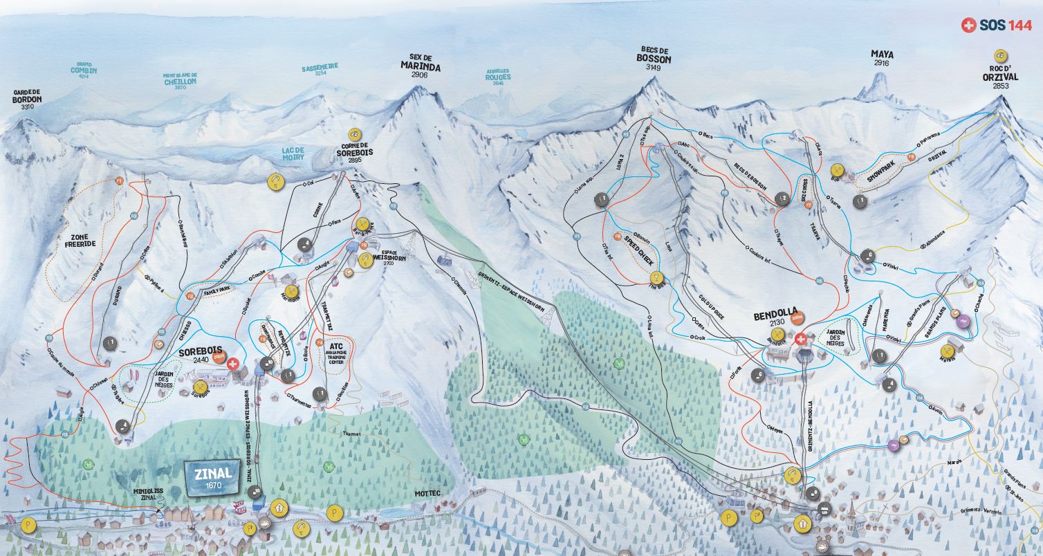 Zurück nach Zinal kannst du die Piste Nr. 3 nehmen und gelangst so über die mittelschwere Abfahrt wieder ins Dorf. Insgesamt gibt es 59 Kilometer mittelschwere Pisten, 27 Kilometer blaue und 30 Kilometer schwarze Pisten. Hier findet also jeder das Richtige. Für Freestyler gibt es den Snowpark Orzival und für Familien einen Snowpark extra für Kinder sowie eigene Kinderbereiche mit Zauberteppichen.
